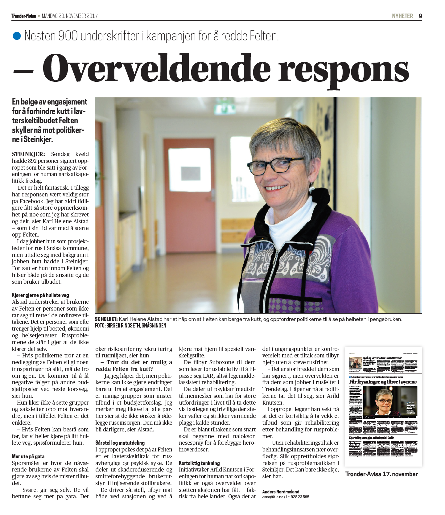 En bølge av engasjement for å forhindre kutt i lavterskeltilbudet Felten skyller nå mot politikerne i Steinkjer. Søndag kveld hadde 892 personer signert oppropet som ble satt i gang av Foreningen for human narkotikapolitikk fredag. Kari Helene Alstad som var med på å starte Felten og oppropets initiativtaker Arild Knutsen er overveldet over responsen.
