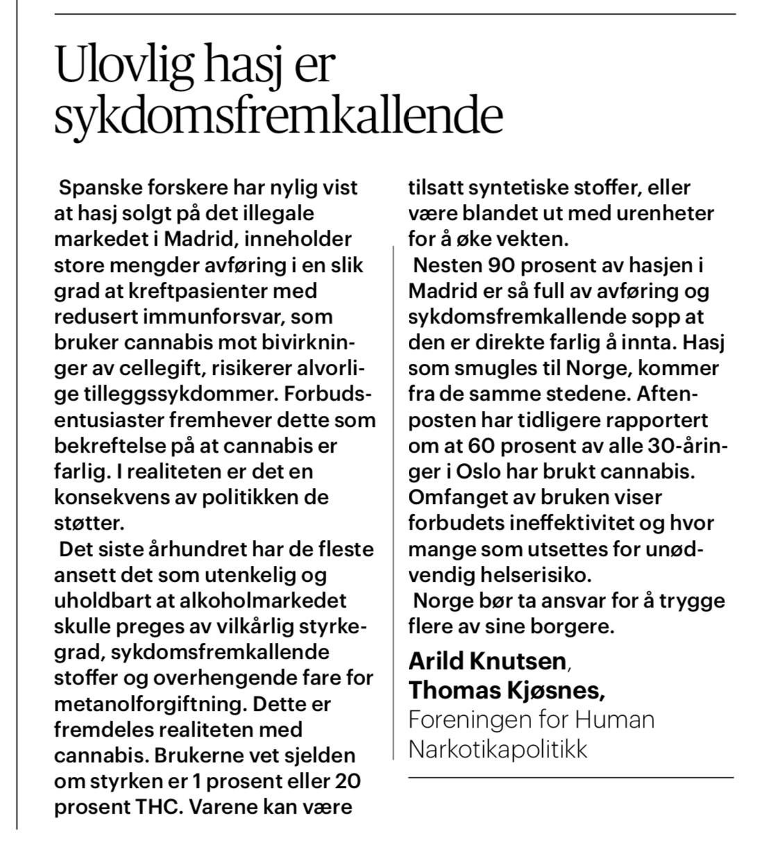 Nesten 90% av hasjen i Madrid er så full av avføring og sykdomsfremkallende sopp at den er direkte farlig å innta. Hasj som smugles til Norge kommer fra de samme stedene. Aftenposten har tidligere rapportert om at 60% av alle 30-åringer i Oslo har brukt cannabis. Omfanget av bruken viser forbudets ineffektivitet og hvor mange som utsettes for unødvendig helserisiko.