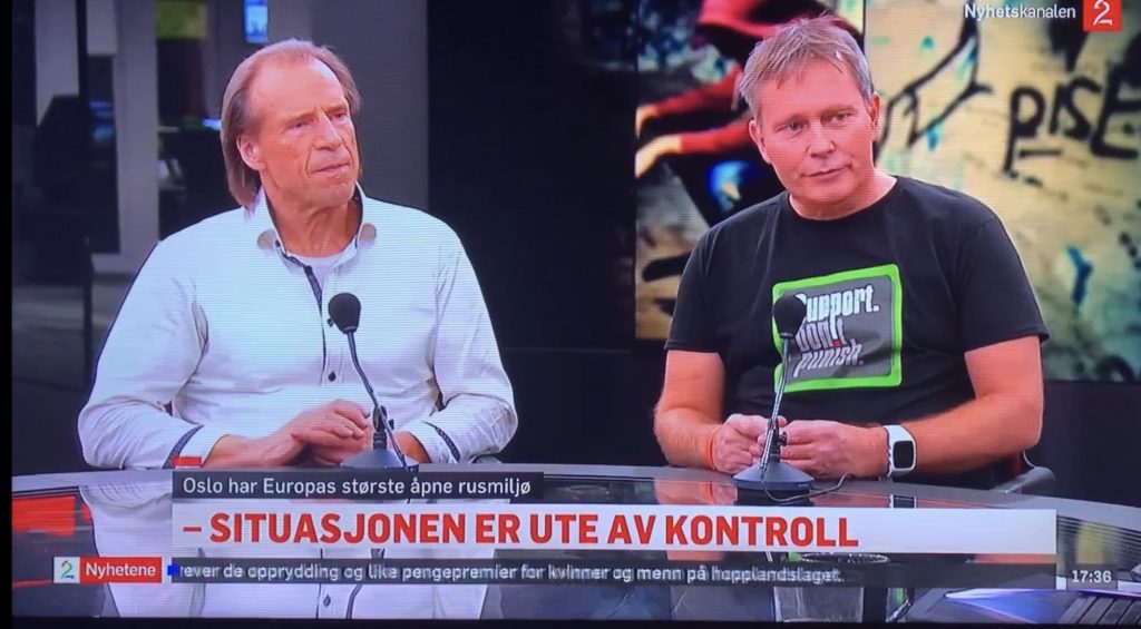 Stortingsrepresentant Jan Bøhler (Ap) og Arild Knutsen i Foreningen for human narkotikapolitikk, snakket om utfordringene med åpne rusmiljøer, på TV2 Nyhetskanalen med programleder Øyvind Brigg. 11. desember 2019.