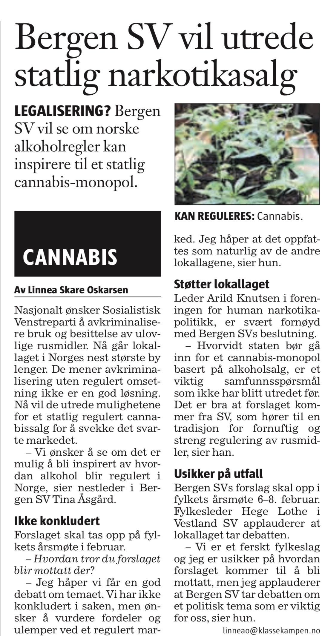 Artikkel i Klassekampen 31. januar 2020: Bergen SV vil utrede statlig narkotikasalg av Linnea skare Oskarsen.