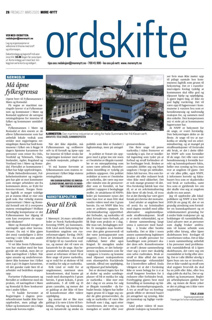 Debattinnlegg i Møre-nytt 27. mars 2020, av Tonje Jevari, organisasjonssekretær i Foreningen for human narkotikapolitikk.