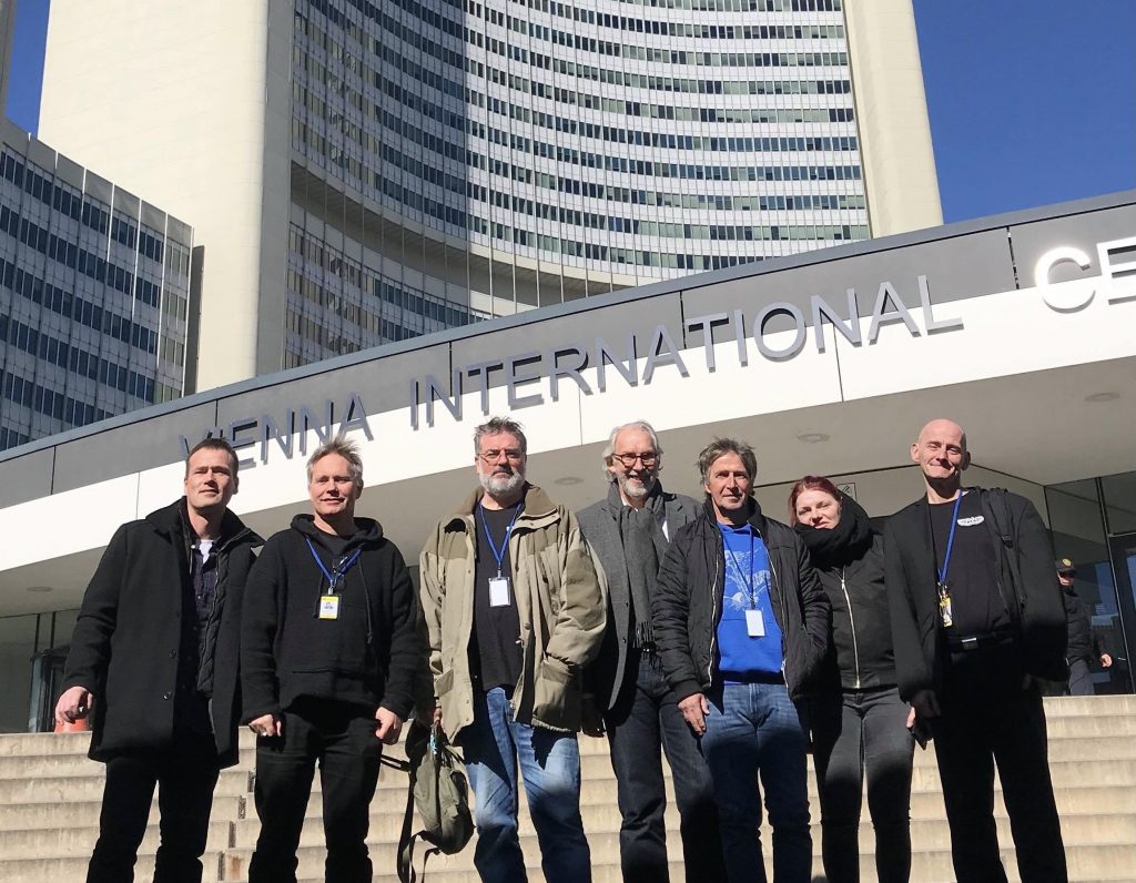 Representanter for FHN, proLAR Nett og Marborg sammen med Venstres stortingsrepresentant Carl-Erik Grimstad under et møte i FNs narkotikakommisjon i Wien i mars 2020.