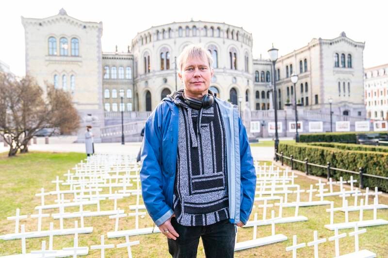 Leder av Foreningen for human narkotikapolitikk (FHN), Arild Knutsen, utenfor Stortinget der Unge Venstre har satt opp 260 hjemmesnekrede kors i forbindelse med rusreformen. (Håkon Mosvold Larsen/NTB)